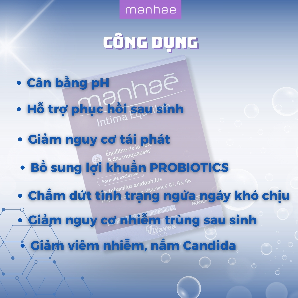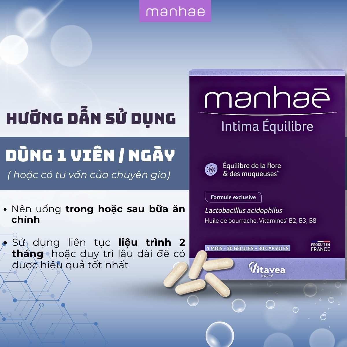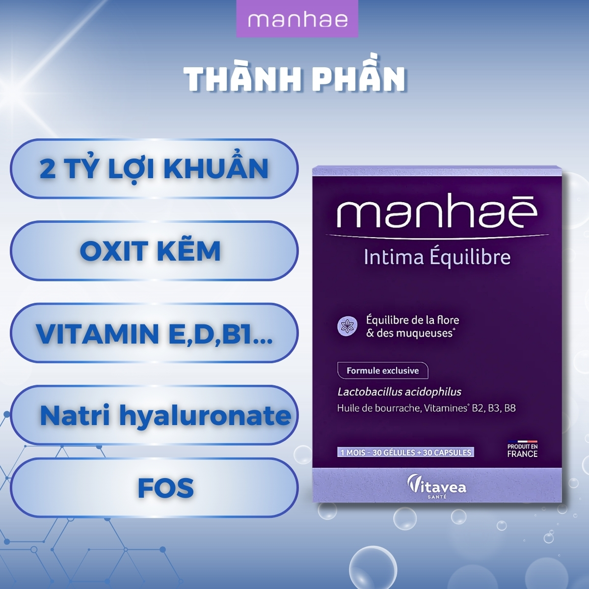 Men lợi khuẩn – hỗ trợ điều trị & phòng ngừa viêm phụ khoa – Manhaé Intima Équilibre (30viên/hộp)